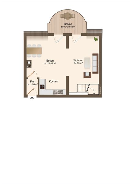 Die erste Ebene ist nahezu komplett offen gestaltet. Hier erwartet Sie neben der Küchenecke (inklusive Einbauküche) ein freundlich heller Wohn-/Essbereich mit gleich zwei Balkonzugängen, welche direkt zum entspannten Verweilen in der Sonne einladen.