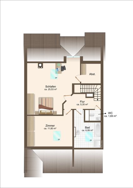 Auf der zweiten Ebene zeigen sich ein großzügiges Schlafzimmer mit praktischem Einbauschrank, sowie einer vorteilhaften Abstellkammer und ein weiterer, Schlafbereich, der alternativ auch z.B. als Büro oder Kinderzimmer genutzt werden kann. Des Weiteren begrüßt Sie das Tageslicht-Bad mit Wanne und ein separat gelegenes WC.