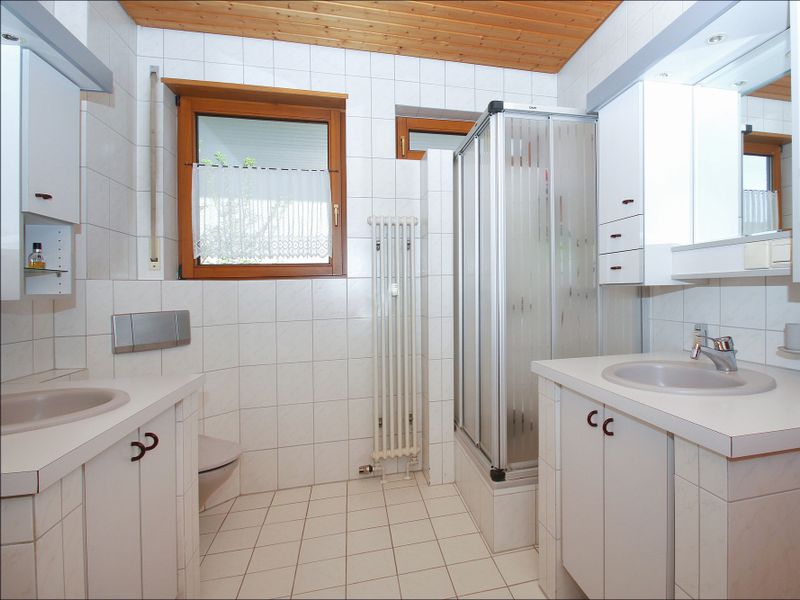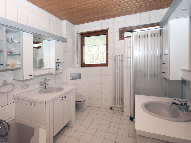 Das Tageslicht-Bad ist mit einer Eck-Badewanne, einer Dusche sowie zwei Waschbecken ausgestattet. Für Gäste steht ein separates WC, ebenso mit Fenster, zur Verfügung.