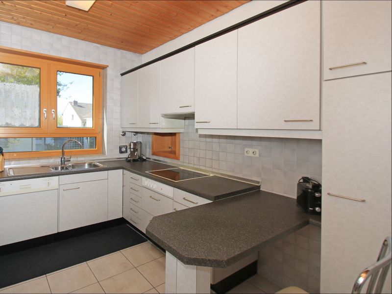 Die Küche ist mit einer Einbauküche ausgestattet, eine klassische „Durchreiche“ verbindet die Küche mit dem Essbereich der Wohnung der ausreichend Platz für gemeinsame Mahlzeiten und gesellige Abende mit Familie und Freunden bietet.