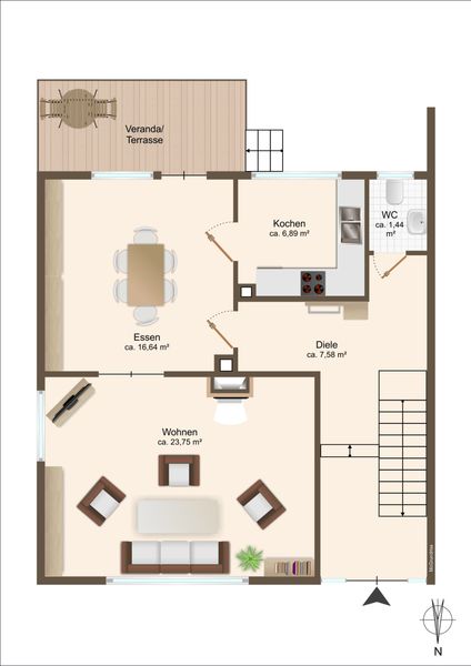Auf ca. 114 m² Wohnfläche und ca. 67 m² Nutzfläche im Keller, stehen Ihnen im Erdgeschoss in großzügiger Aufteilung Wohn- Esszimmer und die Küche mit Einbauküche sowie ein Gäste-WC zur Verfügung. Vom Esszimmer aus begehen Sie die überdachte Terrasse, die Sie im Sommer sicherlich als zweites Wohnzimmer nutzen werden.