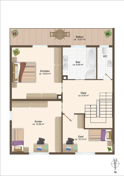 Balkon über die gesamte Hausbreite im Obergeschoss