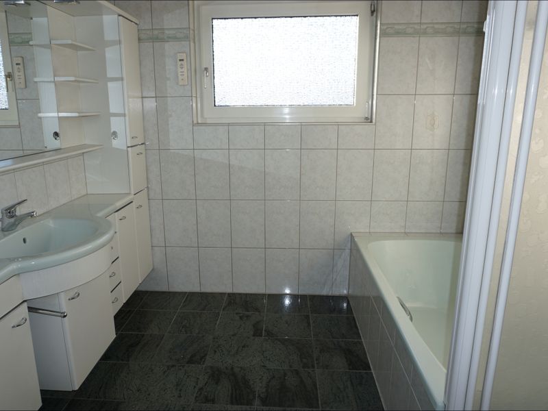 Im Obergeschoss befinden sich zwei Schlafzimmer und eine Ankleide oder Hauswirtschaftsraum, das Tageslicht-Badezimmer mit Wanne und Dusche sowie ein separates WC. Vom nach Süden hin ausgerichteten Schlafzimmer können Sie den Balkon begehen der sich über die gesamte Hausbreite ausdehnt.