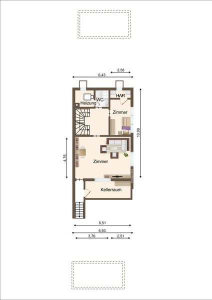 Beim Betreten des Hauses empfängt Sie ein einladender Eingangsbereich, der Zugang zu den beiden Wohnbereichen bietet. Auf der ersten Ebene finden Sie ein geräumiges Wohnzimmer, das dank großer Fenster mit Tageslicht durchflutet ist und über den Balkon einen direkten Zugang zum Garten bietet. Die separate Küche ist mit einer Einbauküche funktional ausgestattet und bietet ausreichend Platz. Ebenfalls im Erdgeschoss befindet sich ein Gäste-WC. Dem Erdgeschoss ist ein zusätzlicher Bereich im Untergeschoss zugeordnet. Hier befinden sich zwei Schlafzimmer und das Dusch-Bad.