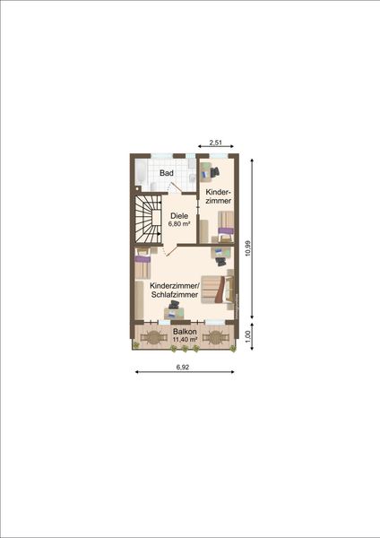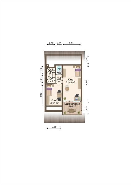 Die obere Etage beherbergt ein weiteres Wohnzimmer, eine separate Küche sowie ein Bad mit Wanne, Dusche und Tageslicht. Das zweite Badezimmer der Immobilie liegt ebenfalls auf dieser Etage und ist so gestaltet, dass es den täglichen Bedürfnissen einer Familie gerecht wird. Im Dachgeschoss stehen zusätzlich zwei weitere Zimmer zur Verfügung. Diese Räume bieten individuelle Gestaltungsmöglichkeiten für jedes Familienmitglied, sei es als Schlafzimmer, Kinderzimmer oder Arbeitszimmer. Eine Loggia im Dachgeschoss gewährleistet ein gemütliches Plätzchen im Freien auch in dieser Etage. Einen Balkon können Sie direkt vom Wohnzimmer im Obergeschoss begehen. Hier erwartet Sie, je nach Jahreszeit, die Mittags- bzw. Abendsonne.