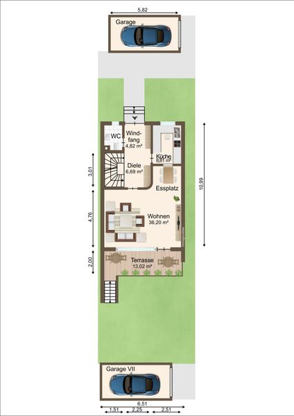 Der Außenbereich des Hauses wird durch kleine, liebevoll angelegte Gartenflächen ergänzt, die zur individuellen Gestaltung und Nutzung einladen.